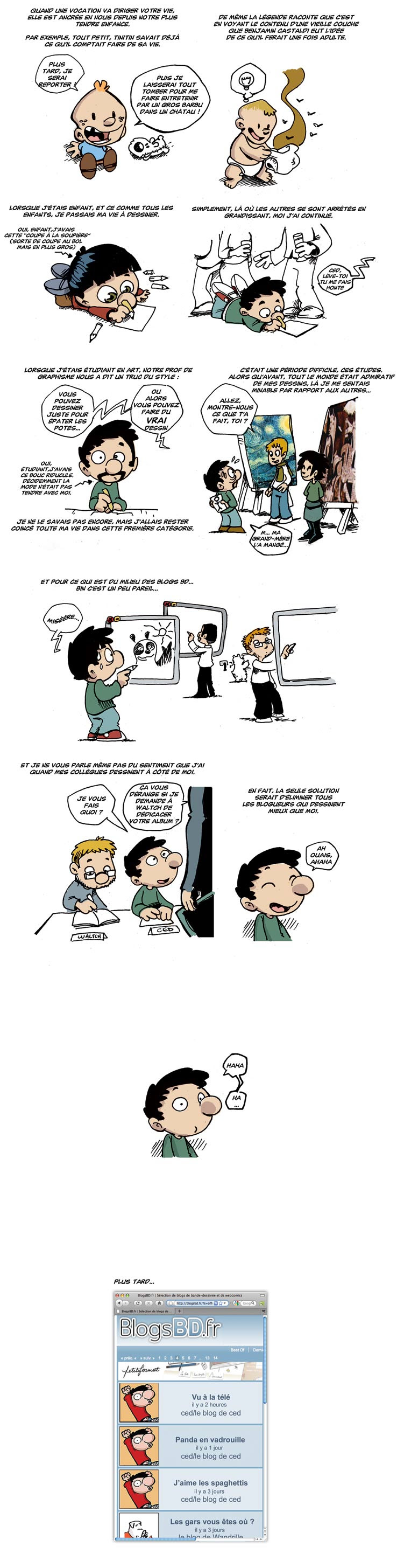 Même si tu ne dis pas ça pour avoir des compliments ou être réconforté, sache qu'on est nombreux à beaucoup t'aimer, enfin à aimer ton travail, tes dessins et personnellement je suis triste les jours où je n'ai pas de dessin de Ced ! Il n'y a pas de grands et de petits dessinateurs de BD, il y a les passionnés et les autres :) Toi, tu es dans la première catégorie ! Continue de nous faire rire et sourire ! Biz biz