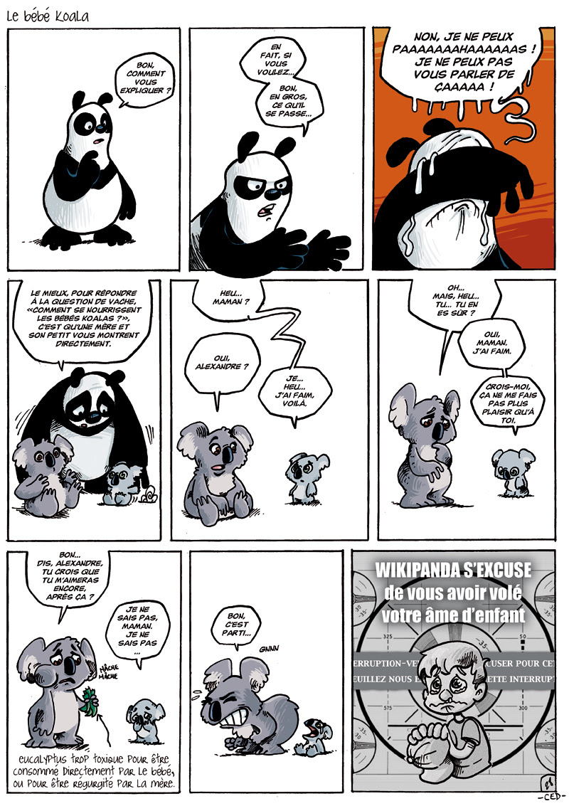 Sachez que Wikipanda est fini ! Pour fêter ça, une planche inédite. Cette version-là a été refusée par l'éditeur (et je les comprend, mais j'ai essayé).